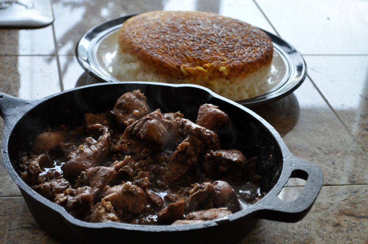 【材料】鶏肉またはアヒル肉、クルミ(砕いたもの)、ザクロペースト(ロブ・エ・アナール)、玉ねぎ、砂糖(少量)、塩、ターメリック、サフラン。【調理】玉ねぎを炒め、砕いたクルミを加えて炒める。水とザクロペーストを加え、肉を入れて弱火で2-3時間煮込む。甘酸っぱさのバランスを整えて提供。