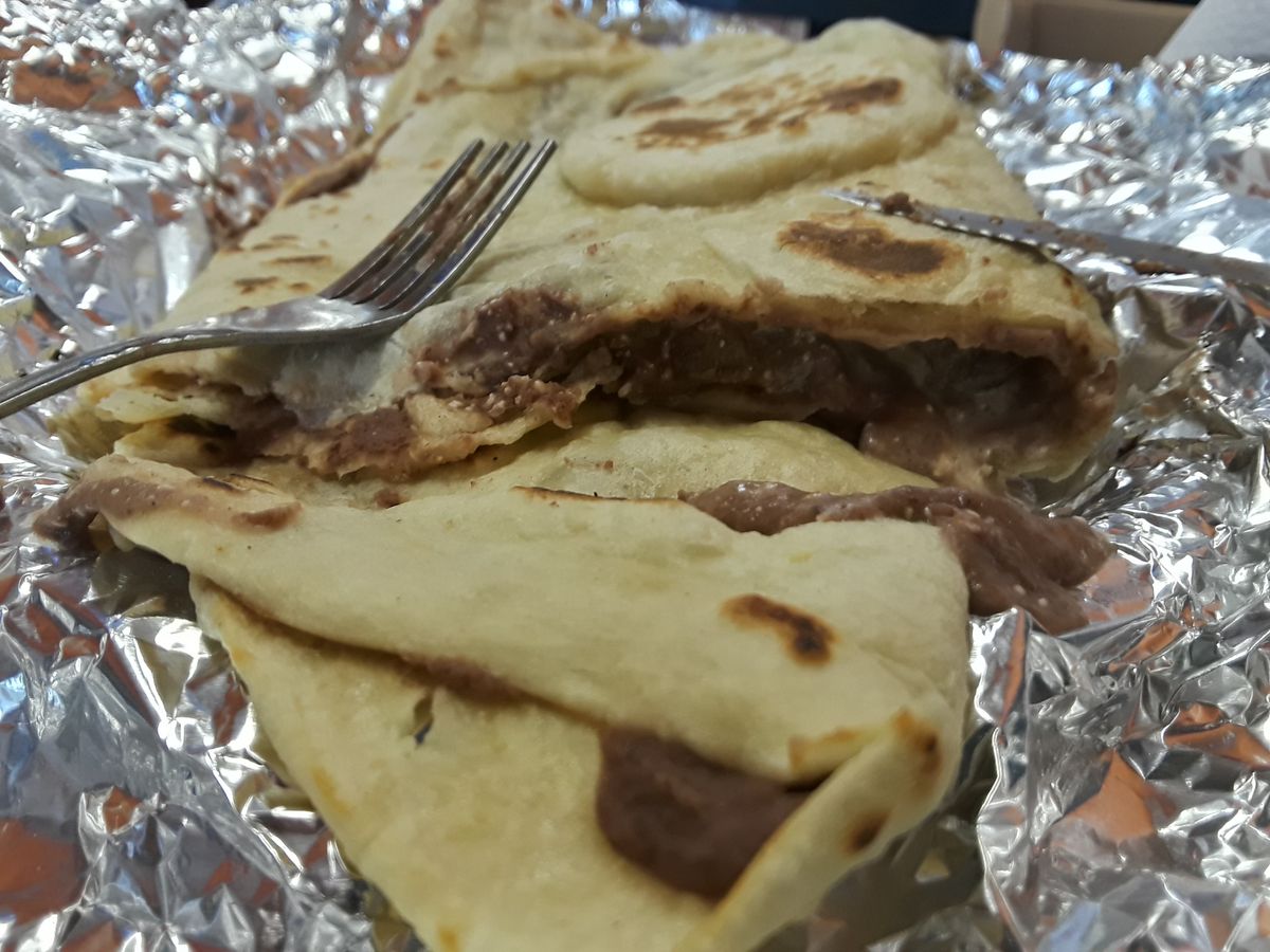 【材料】小麦粉トルティーヤ、フリホーレス・レフリトス、ホンジュラスクリーム、チーズ、スクランブルエッグ、アボカド、揚げプランテン、挽肉またはチョリソ。【調理】ベースのバレアーダ・センシージャに各種トッピングを加え、半分に折って提供。
