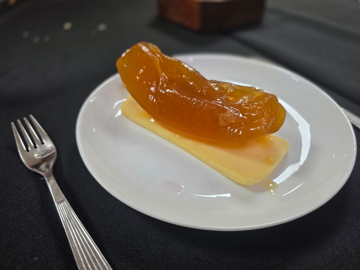 青パパイヤを砂糖シロップで2〜3時間じっくり煮込んだグアラニー族由来のデザート。外はしっとりキャラメル色に透き通り、中は柔らかい。クリームチーズや冷たい牛乳と共に食べるのが定番。
