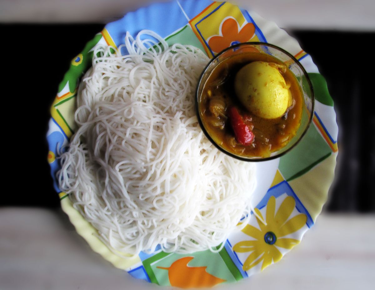 米粉を練って専用の型から細い麺状に押し出し、蒸し上げた伝統的な主食。円盤状に成形され、カレーやサンボルと共に朝食や夕食に食べる。繊細な食感が魅力。