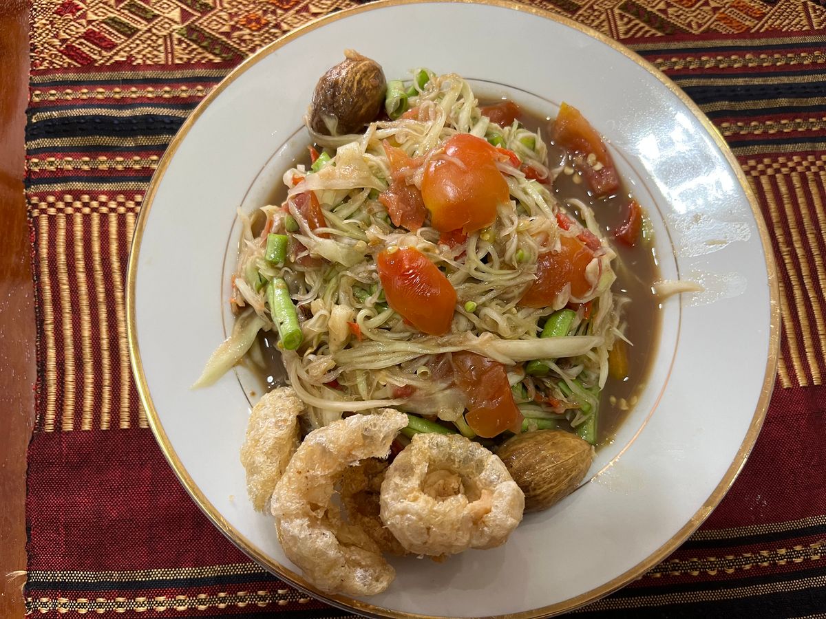 ラオス版の青パパイヤサラダ。タイのソムタムと似ているが、パデーク(発酵魚醤)を使うのがラオスの特徴で、より塩気と旨味が強い。青パパイヤを千切りにし、すり鉢で叩いて調味料をなじませる。カオ・ニャオ、ラープと並ぶラオス三大国民料理の一つ。