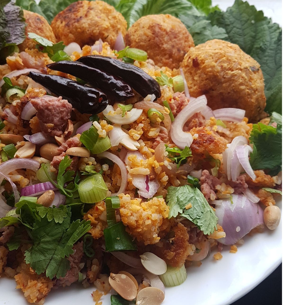 ນ້ຳເຂົ້າທອດ (Nam Khao Tod (Crispy Rice Salad))
