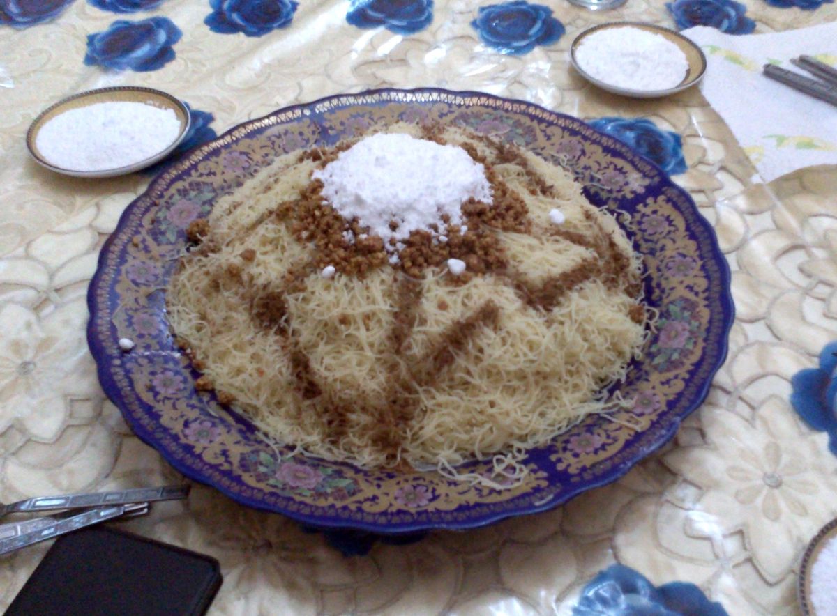 極細パスタ(シャリーヤ)を蒸し器で蒸す。バターと砂糖を加えてほぐす。鶏肉を玉ねぎ、サフラン、塩、胡椒、シナモンと共に煮込む。大皿にパスタを山のように盛り、中央に煮込んだ鶏肉を埋め込む。表面をパスタで覆い隠す。粉砂糖とシナモンで模様を描いて飾る。揚げアーモンドを散らす。