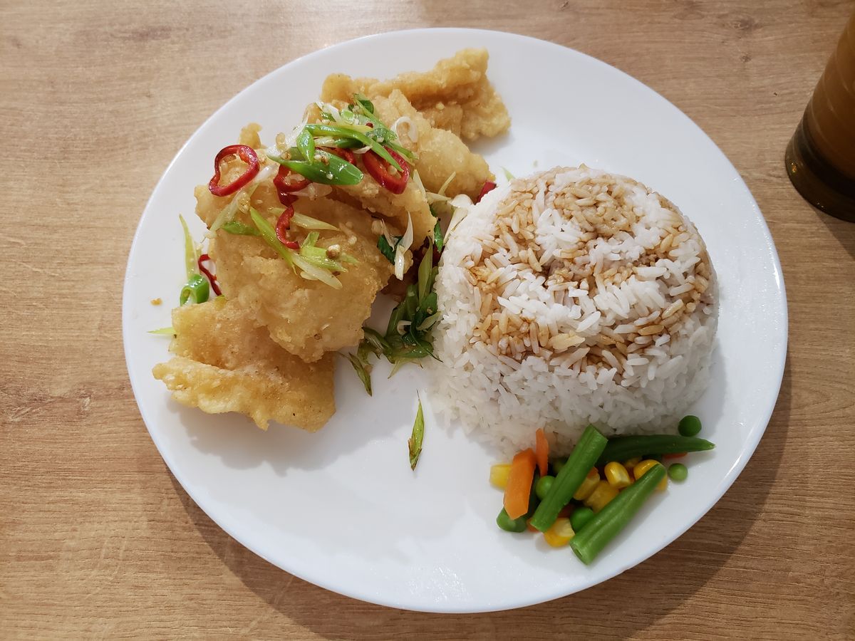 イカの胴体を輪切りにし、足は食べやすい大きさに切る。コーンスターチに塩、白コショウ、五香粉、ガーリックパウダーを混ぜた粉をまぶす。180℃の油で1-2分カリッと揚げる。千切りの青唐辛子、スライスしたネギと一緒に盛り付け、レモンウェッジとアイオリソースを添える。