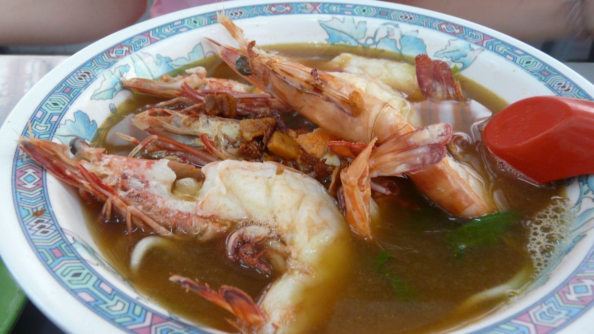 エビの頭と殻を長時間煮込んだ濃厚な出汁のスープ麺。豚骨スープをブレンドし、深いうま味と甘みが特徴。黄麺とビーフンのミックスに、エビ・豚バラ・魚のすり身などをトッピング。サンバルチリを添える。