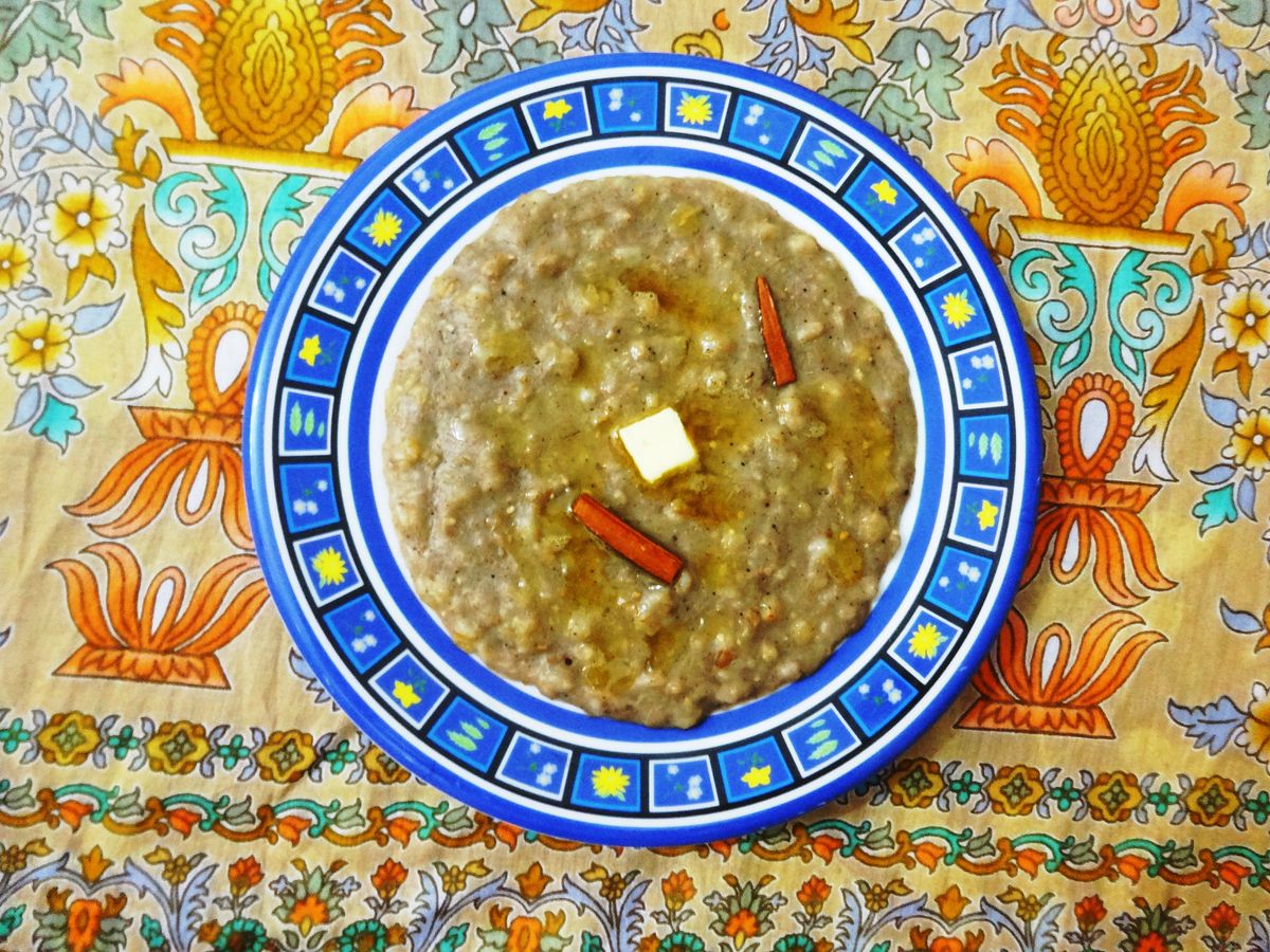 1. 粗挽き小麦を一晩水に浸す 2. ラム肉を大きめに切り、塩・胡椒で下味をつける 3. 大鍋に小麦・肉・水・塩を入れ、弱火で3〜4時間煮込む 4. 肉が崩れるまで煮たら、木べらで叩いて滑らかなポリッジ状にする 5. 器に盛り、溶かしバターをたっぷりかけ、シナモンパウダーをふって提供