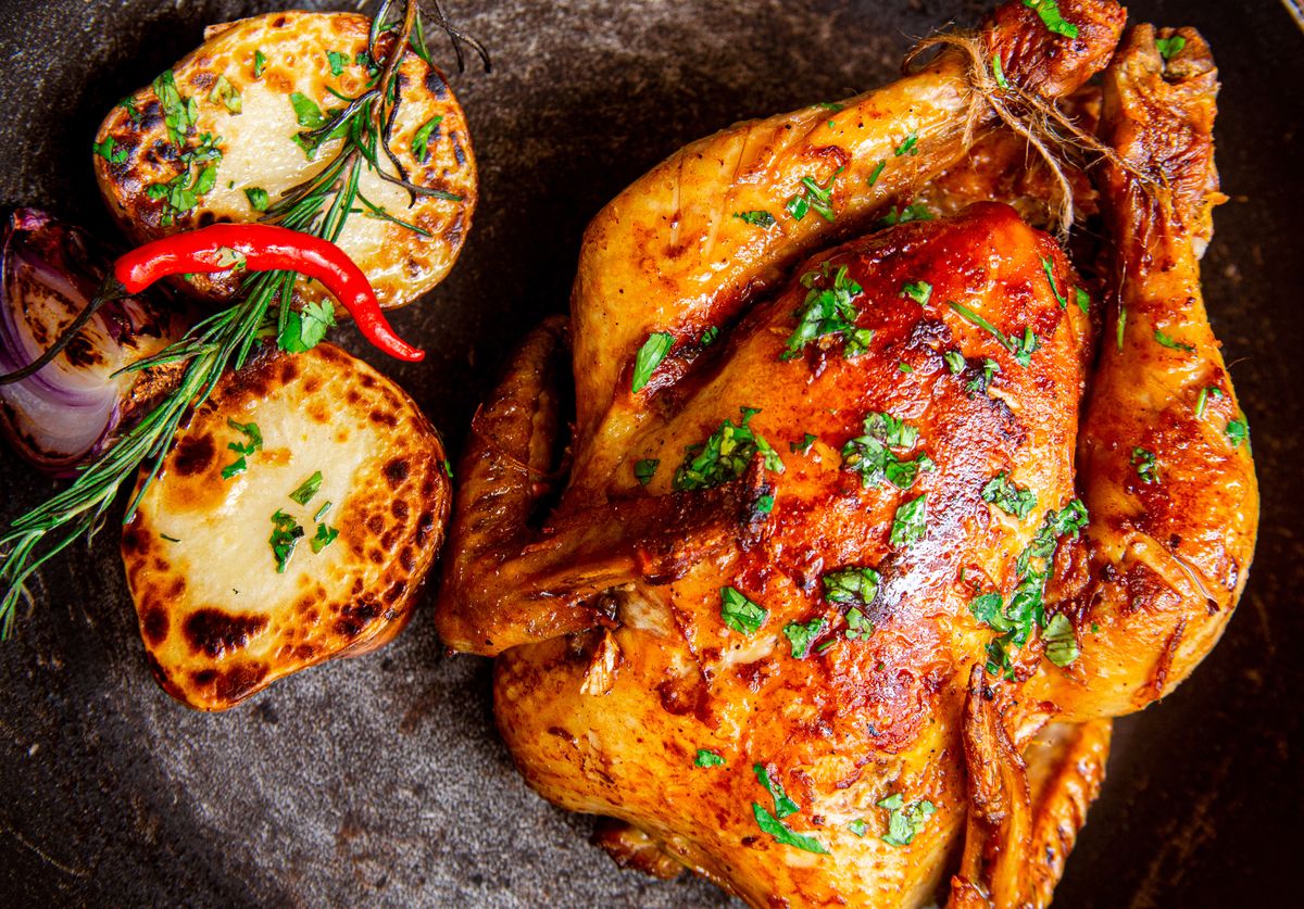 1. 丸鶏を開いて平らにする 2. ヨーグルト・ニンニク・レモン汁・クミン・パプリカ・ターメリック・コリアンダー・塩胡椒でマリネし、最低2時間漬ける 3. 炭火グリルまたはロティサリーオーブンに設置 4. 中火でじっくり焼く(40〜60分、途中でマリネ液を塗る) 5. 皮がパリパリになり中まで火が通ったら取り出す 6. カットしてガーリックソース・フムス・サラダ・ホブズと提供