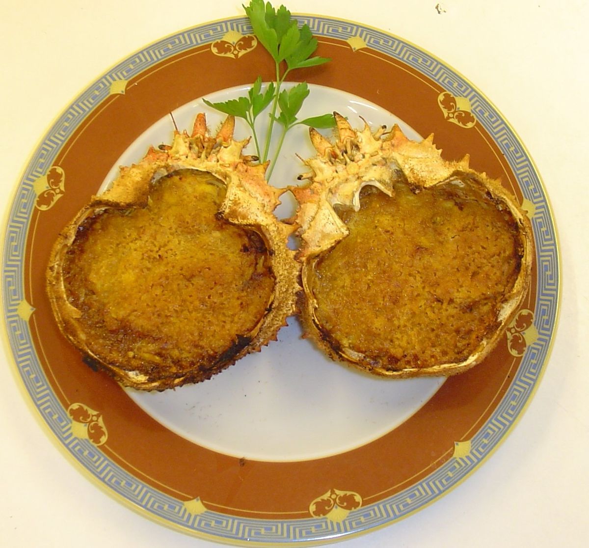 蜘蛛蟹を茹でて身をほぐし、甲羅を綺麗に洗う。玉ねぎのみじん切りをオリーブオイルで炒め、トマトのすりおろしを加える。ブランデーでフランベし、白ワインを加えて煮詰める。蟹の身を加えて混ぜ、甲羅に詰める。パン粉とバターをのせ、200℃のオーブンで15分焼いて表面を黄金色にする。