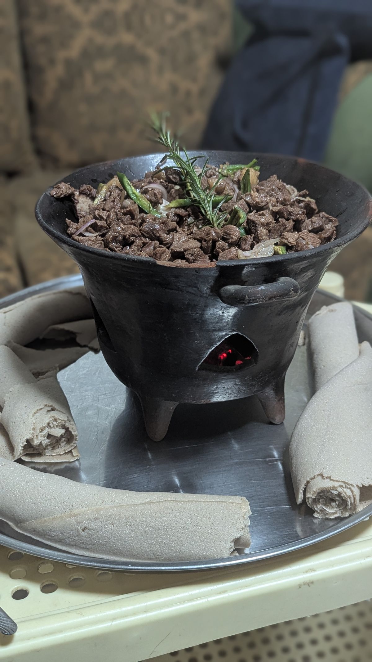 牛肉を一口大に切り、塩コショウする。フライパンでニテルキベを強火で熱し、牛肉を入れて表面を焼く。玉ねぎの薄切りを加えて炒め、ニンニクと生姜のみじん切りを加える。ピーマンとトマトの角切りを加えて手早く炒める。ローズマリー、唐辛子を加えて塩で味を調える。インジェラの上に盛り付ける。