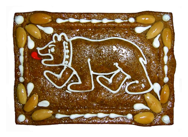 ヘーゼルナッツ300gをローストして粗く刻む。蜂蜜200g、砂糖100gを鍋で温め、小麦粉100g、シナモン小さじ2、クローブ小さじ1/2、ナツメグ少々、ベーキングパウダー小さじ1、オレンジピール50g、レモンピール30gを加える。ナッツを混ぜ込み、オブラートの上に生地を1cm厚に広げ、180℃で20分焼く。