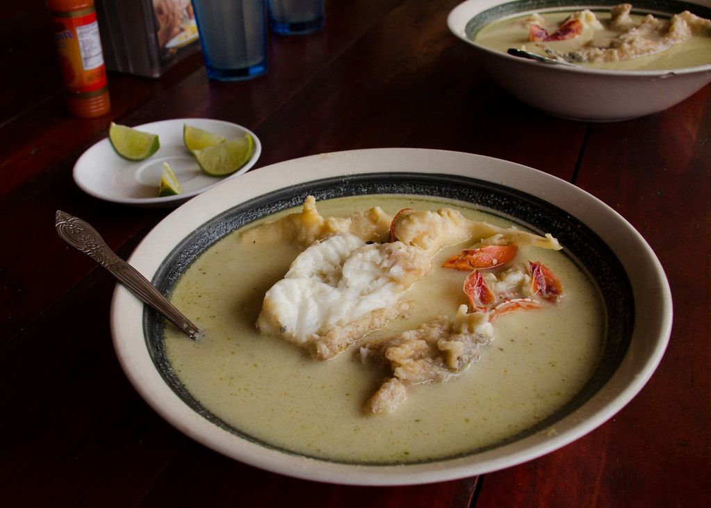緑プラタノ6本を皮付きのまま塩茹でし、柔らかくなったら皮を剥いて木臼で搗き潰す。別鍋でココナッツミルク500ml、にんにく2片、玉ねぎ半分を煮立て、白身魚の切り身500gを入れて弱火で15分煮る。コリアンダー、塩、黒胡椒で味付け。搗き潰したプラタノを丸く盛り、ココナッツフィッシュスープをかけて提供。