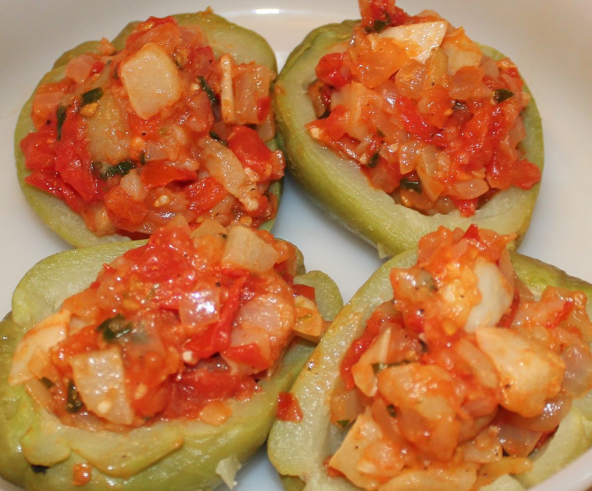 チャヨーテ4個を半分に切り、塩水で柔らかくなるまで茹でる。中身をスプーンでくり抜き、刻んで溶かしバター30g、卵1個、パン粉大さじ3、すりおろしチーズ100g、砂糖大さじ2、シナモン少々と混ぜる。チャヨーテの殻にフィリングを詰め、チーズをのせて180℃のオーブンで20分焼く。