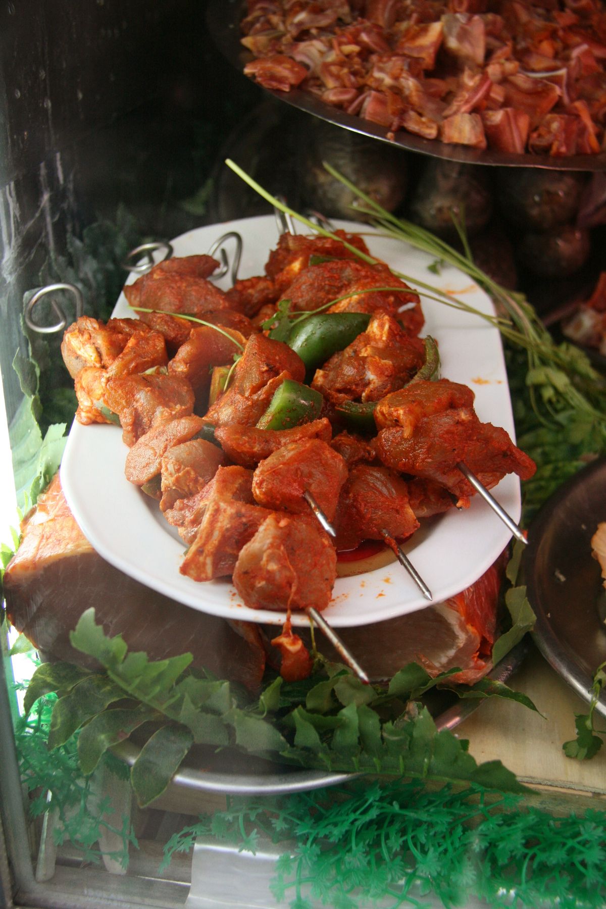 牛もも肉500gを3cm角に切り、醤油大さじ2、ライム汁大さじ1、にんにく2片すりおろし、クミン小さじ1、塩胡椒で1時間マリネ。ピーマン2個、玉ねぎ1個も大きめに切る。串に肉・ピーマン・玉ねぎを交互に刺し、炭火またはグリルで各面3〜4分ずつ焼く。マスタードマヨネーズソースを添えて提供。