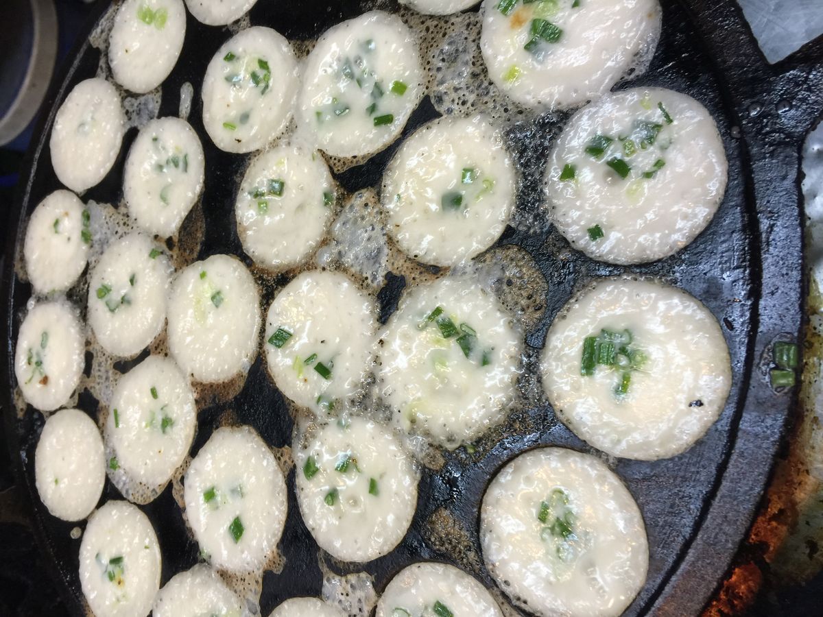 【生地(下層・カリカリ層)】米粉100g、砂糖大さじ2、水150mlを混ぜ合わせて滑らかな生地を作る。【生地(上層・クリーミー層)】ココナッツミルク200ml、米粉大さじ2、砂糖大さじ1、塩少々を混ぜる。パンダンリーフの絞り汁を加えると香りが良い。【焼き方】カノムクロック用の鋳鉄鍋に薄く油を塗り、中火で温める。各くぼみに下層の生地を7分目まで入れ、ネギやコーンなどのトッピングを少々のせる。上層のココナッツ生地を上からかけて蓋をし、3〜5分蒸し焼きにする。縁がカリッと焼けたら2つを合わせて完成。