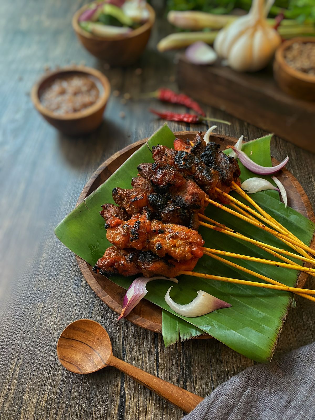 【材料】豚ロース肉300g、ココナッツミルク100ml、ターメリック小さじ1、コリアンダーパウダー小さじ1、クミン小さじ1/2、レモングラス1本(みじん切り)、ニンニク2片、パームシュガー大さじ1、ナンプラー大さじ1、竹串10本 【ピーナッツソース】ローストピーナッツ100g、ココナッツミルク100ml、レッドカレーペースト大さじ1、タマリンドペースト大さじ1、パームシュガー大さじ2、塩少々 【作り方】1. 豚肉を5mm厚の短冊状に切る。2. ココナッツミルク、ターメリック、コリアンダー、クミン、レモングラス、ニンニク、パームシュガー、ナンプラーを混ぜてマリネ液を作る。3. 豚肉を漬け込み、最低2時間冷蔵庫で休ませる。4. 竹串に波打つように刺す。5. 炭火またはグリルで両面を焼き、途中ココナッツミルクを刷毛で塗る。6. ピーナッツソース:ピーナッツを粗く砕き、鍋にカレーペーストを炒め、ココナッツミルク、タマリンド、砂糖を加えて煮詰め、ピーナッツを混ぜる。7. アチャート(きゅうりと赤玉ねぎの甘酢漬け)と共に盛り付ける。