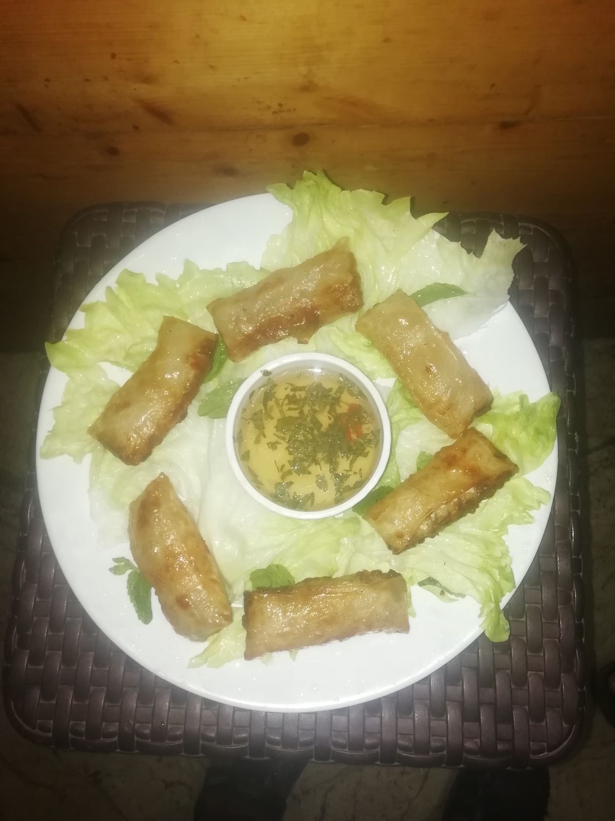 豚ひき肉、エビ、きくらげ、春雨などをライスペーパーで巻いて揚げた南部式揚げ春巻き。パリパリの食感とヌクチャムの甘酸っぱいたれが特徴。