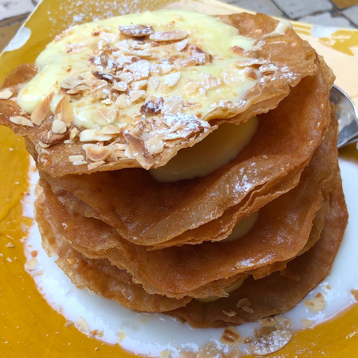 材料:フィロ生地8枚、アーモンド200g、砂糖100g、シナモン小匙2、オレンジブロッサム水大匙2、バター100g、ハチメージ200g。作り方:アーモンドを雰囲せてペーストにし、砂糖、シナモン、オレンジブロッサム水と混ぜる。フィロ生地にバターを塗ってアーモンドペーストを置き、らせん状に巻いて180℃で25分雰囲せる。ハチメージオレンジブロッサム水のシロップをかけ、ピスタチオをトッピング。