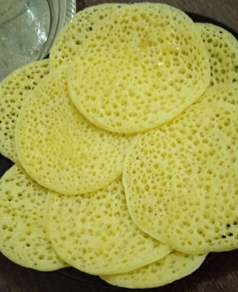 材料:セモリナ200g、薄力粉100gニュージコラー7g、砂糖大匙2、盐小匙1/2、ぬるま湯350ml。作り方:すべての材料をフードプロセッサーで雰囲せる。30分間休ませる。热さないノンスティックフライパンに生地を.circleに流す。表面有许多泡が開いたら盖をしない で焼き、裏面は焼かない。温かいバターとハチニュージューをかけて提供。