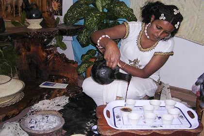 コーヒー発祥の地エチオピアの伝統的なコーヒーセレモニー。生豆をその場で焙煎し、乳鉢で砕き、ジャバナ(首の長い土製のポット)で3回煮出して供する。最初の1杯目をアボル、2杯目をトナ、3杯目をバラカと呼び、3杯すべて飲むのが礼儀。乳香(フランキンセンス)を焚き、ポップコーンやコロ(ローストした穀物)を添える。単なる飲み物ではなく、1〜2時間かける社交的な儀式。エチオピアのおもてなしの象徴。
