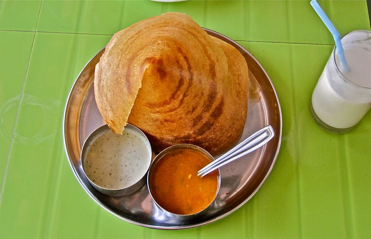 南インドを代表する朝食・軽食。米とウラドダル(黒レンズ豆)を発酵させた生地を薄くクレープ状に焼き、スパイスで味付けしたジャガイモのフィリングを包む。ココナッツチャトニーとサンバル(野菜の豆カレー)を添えて食べる。
