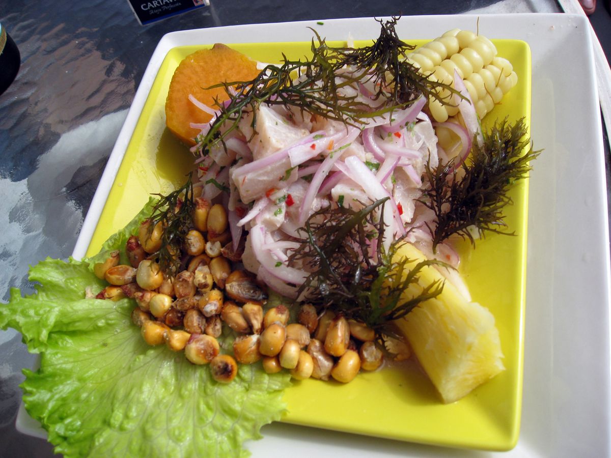 ペルーの国民的料理。新鮮な白身魚をライム果汁(レチェ・デ・ティグレ)で「調理」し、赤玉ねぎ、アヒ・アマリージョ、コリアンダーで味付けする。サツマイモ(カモーテ)とトウモロコシ(チョクロ)を添えて提供される。酸味と辛味のバランスが絶妙で、魚の旨味を最大限に引き出す。