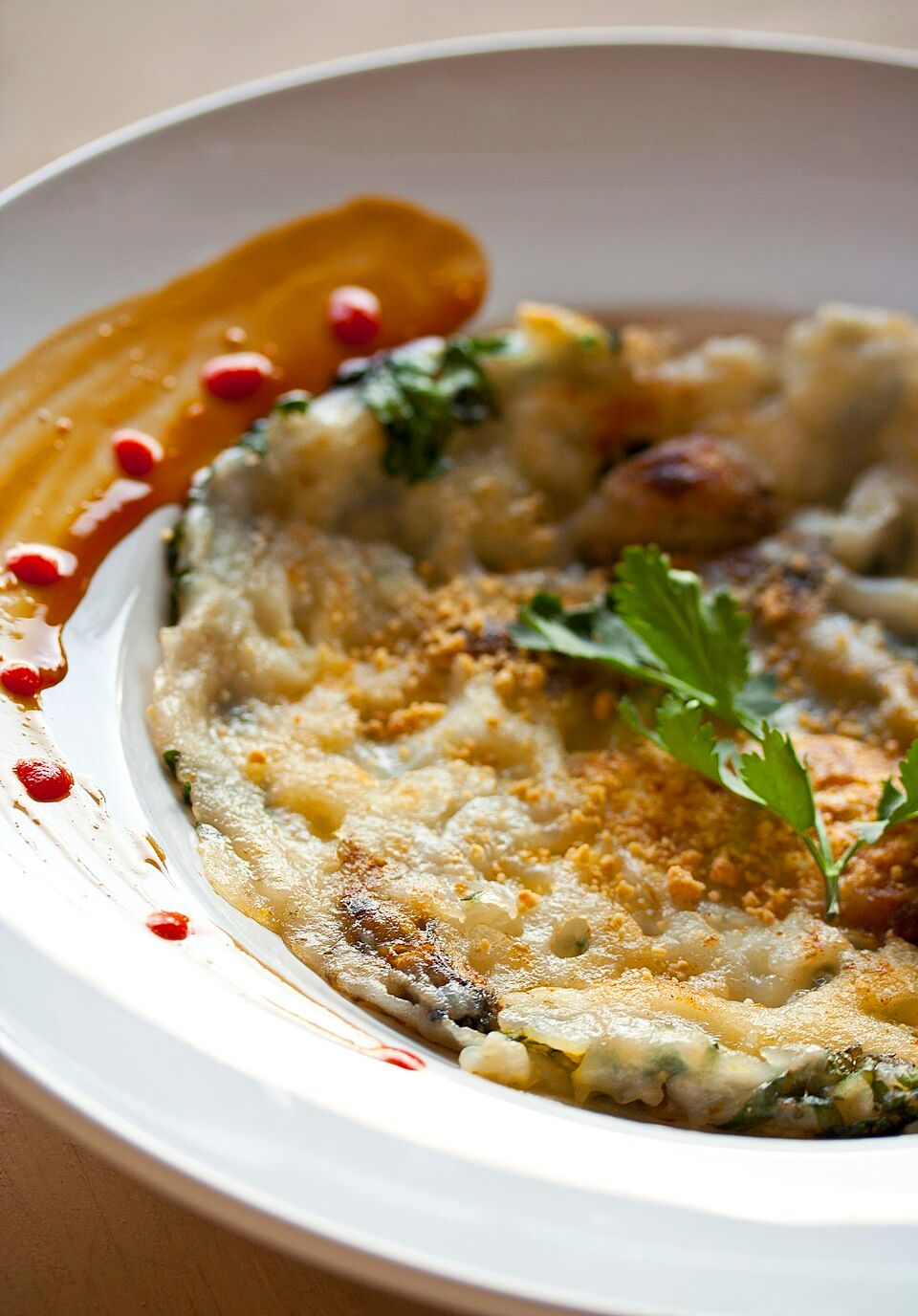 さつまいも粉を水で溶いてとろみのある生地を作る。熱した鉄板に油を敷き、小粒の牡蠣を並べ、生地を流し入れる。卵を割り入れ、小松菜を加えて焼き上げる。甘辛いチリソースをかけて提供する。