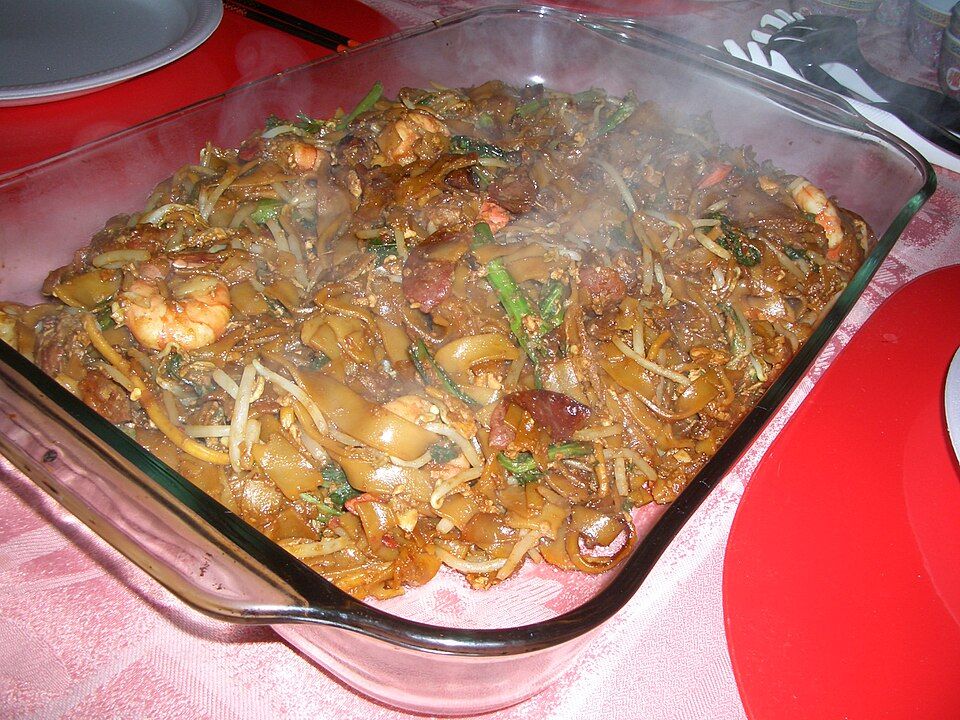 平たい米麺(クイティオ)と黄色い卵麺を、ラード、ニンニク、醤油で強火で炒めた屋台の定番麺料理。「チャー」は炒める、「クイティオ」は米麺の意味。高温のウォックで一気に炒めることで生まれる「ウォックヘイ(鑊気)」と呼ばれる香ばしい燻煙香が命。具材はエビ、ハマグリ(血蛤)、中華ソーセージ(腊腸)、もやし、卵、ニラ。ダークソイソースの甘みとラードの香ばしさが特徴的な、シンガポールのソウルフード。
