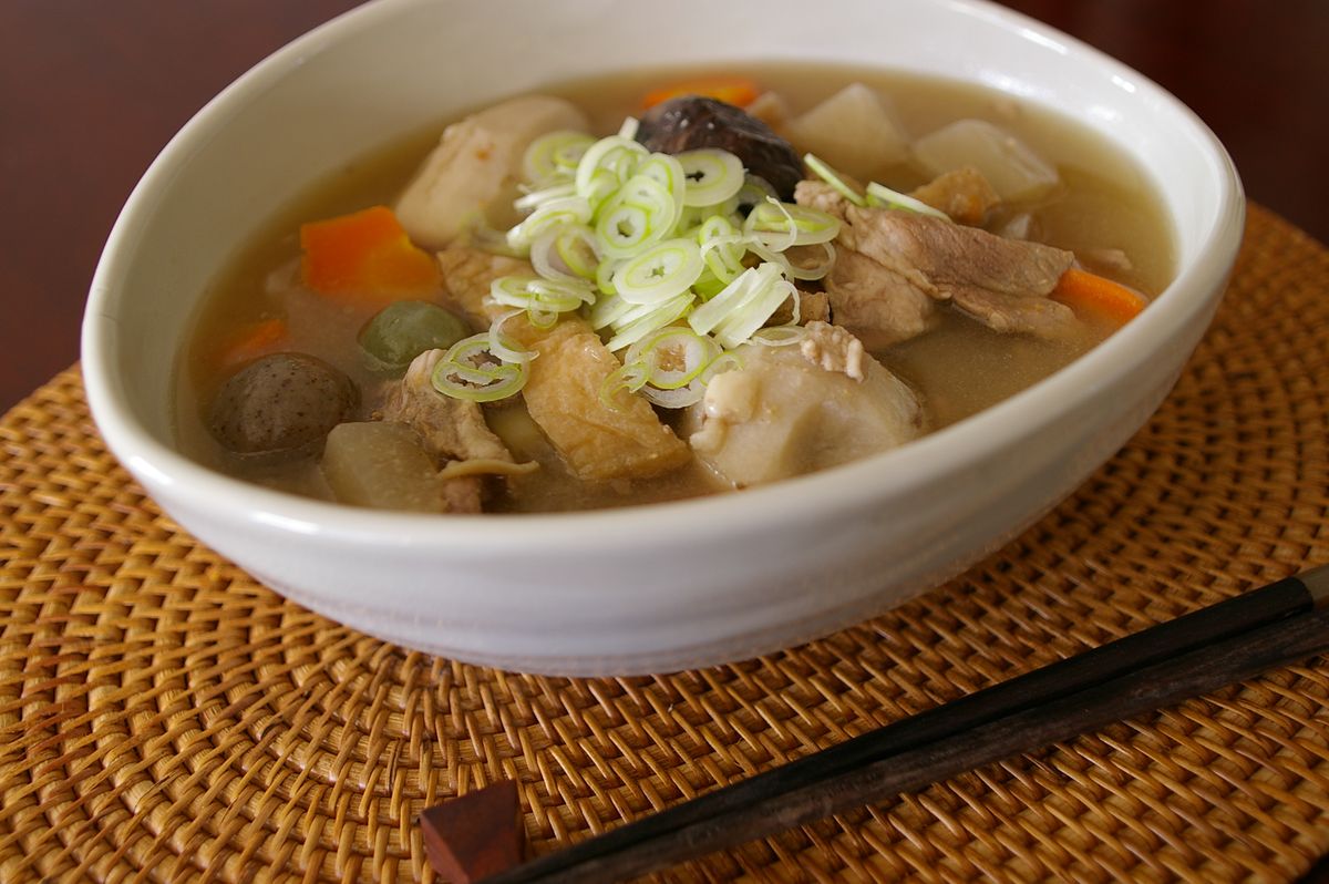 豚バラ肉と大根・にんじん・ごぼう・里芋・こんにゃくなどの根菜をたっぷり入れた味噌仕立ての具沢山汁。味噌汁の豪華版ともいえ、一杯でおかずにもなる栄養満点の家庭料理。生姜やごま油を加えるとコクが増す。
