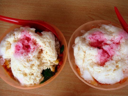 マレー語で「豆の氷」を意味する、シンガポールの代表的なかき氷デザート。ABC(Air Batu Campur=混ぜ氷)とも呼ばれる。山のように盛った削り氷の下に小豆・アタップチー(パームの実)・仙草ゼリー・スイートコーン・寒天(アガーアガー)を敷き、上からグラマラカ(パームシュガー)シロップ・ローズシロップ・パンダンシロップの3色のシロップと練乳をかける。1948年頃には1皿20セントで売られていた歴史あるデザート。熱帯の暑さを吹き飛ばす定番スイーツ。
