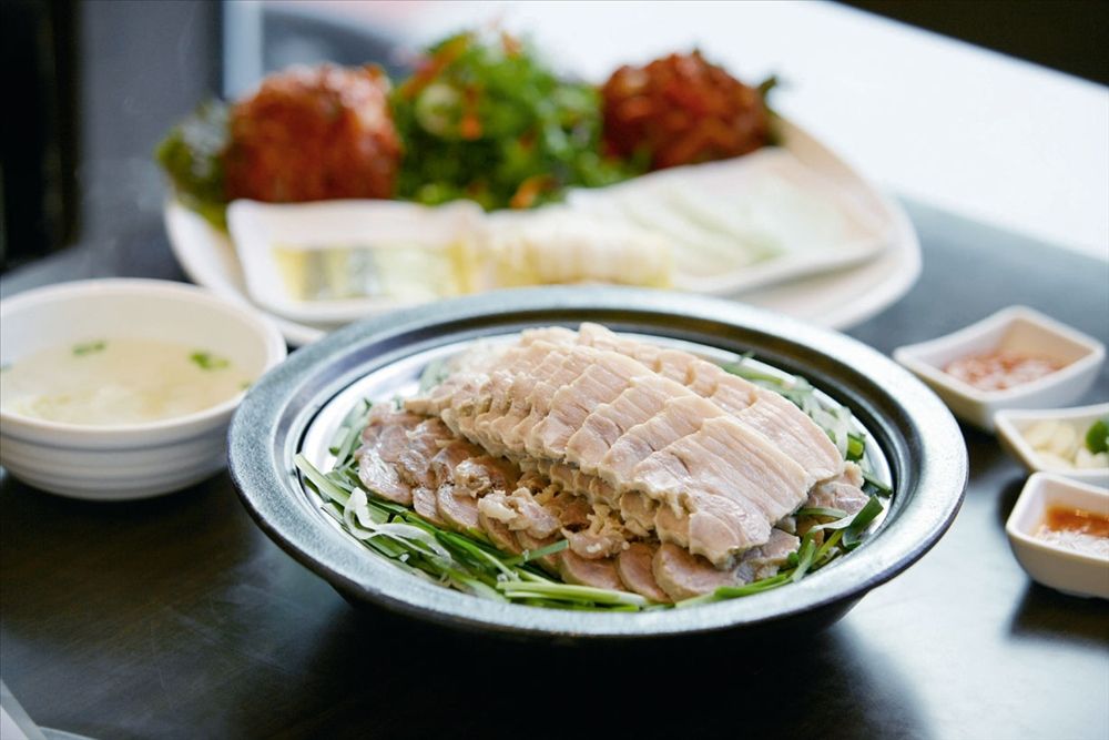 豚バラ肉を香辛料入りの茹で汁でじっくり茹で上げ、薄切りにしてサンチュやキムチで包んで食べる料理。サムジャン(味噌ダレ)やアミの塩辛を添え、さっぱりとした食べ方が魅力。
