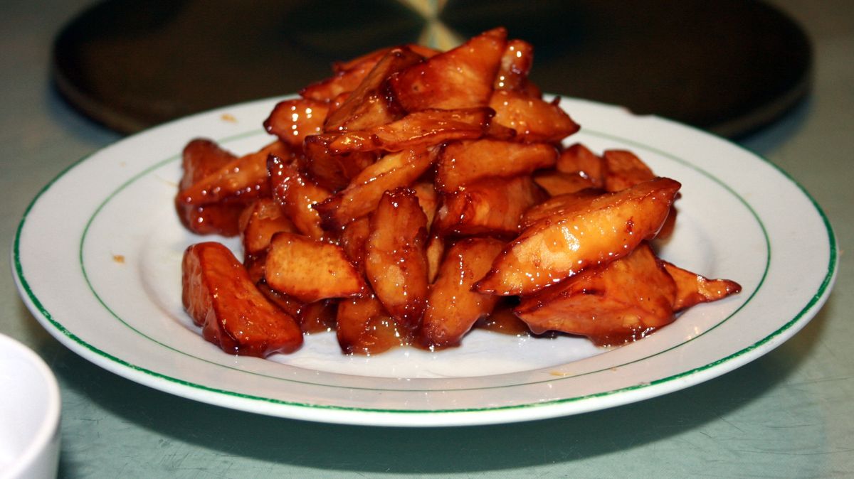 揚げたサツマイモに飴状のカラメルを絡め、箸で持ち上げると糸を引く山東発祥のデザート。中国の宴会料理の定番で、パフォーマンス性も高い。熱いうちに冷水にくぐらせて食べるのが伝統的。