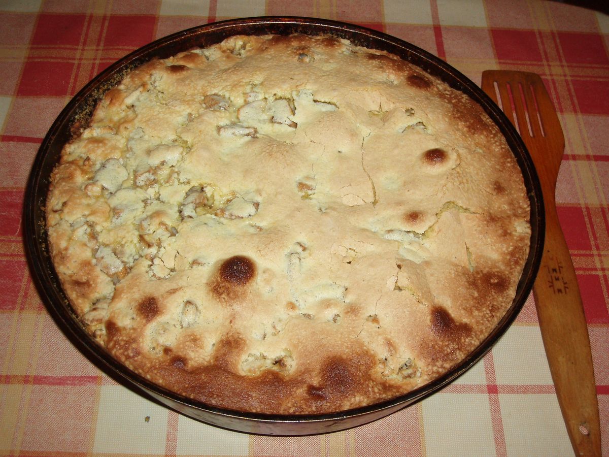 卵3個と砂糖を白っぽくなるまで泡立てる。小麦粉をさっくり混ぜる。りんご3〜4個を薄切りにし、バターを塗った型の底に敷き詰める。生地を流し入れ、180℃のオーブンで35〜40分焼く。粉砂糖を振って仕上げる。