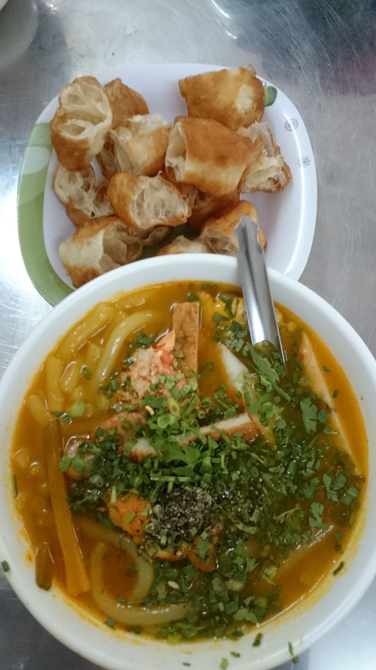 蟹を茹でて身を取り出し、殻からスープを取る。蟹の卵を炒めて蟹肉と混ぜる。タピオカ粉と米粉を混ぜて太麺を作る(または市販品を使用)。蟹スープに魚醤・砂糖で味を付け、片栗粉でとろみをつける。太麺を茹でて器に入れ、スープを注ぎ、蟹肉・豚つくね・うずら卵をのせ、ネギ油を回しかける。