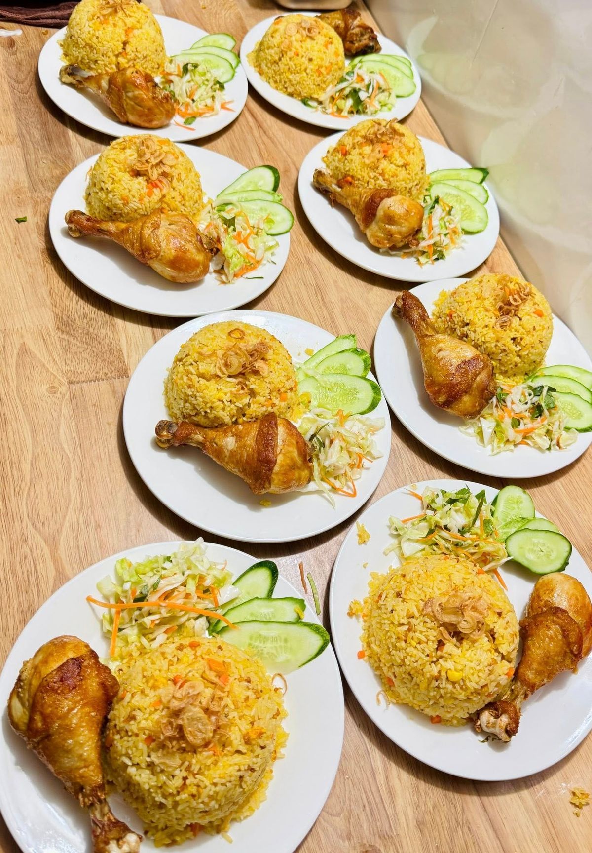 鶏を丸ごと茹で、スープを取る。スープでターメリック・ニンニク・油を加えてご飯を炊く。鶏を冷まして手で裂き、玉ねぎの薄切りをライム汁と砂糖で漬ける。黄色いご飯を皿に盛り、裂き鶏・酢漬け玉ねぎ・ラウラム・バジルをのせる。ヌクチャムと鶏スープを添える。