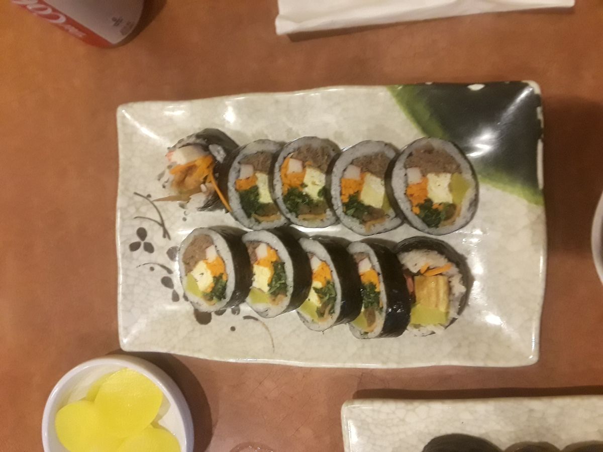 甘辛く味付けした牛肉を主役にしたキンパ。プルコギ風の牛肉にたくあん・ほうれん草・にんじん・卵を巻く定番スタイル。ごま油の香りが食欲をそそる。