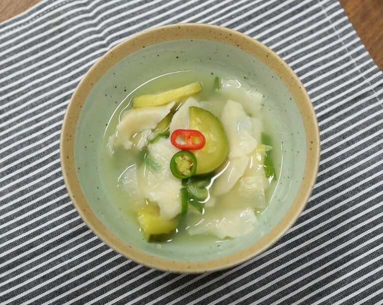 小麦粉と水で生地を作り寝かせる。キムチ、ジャガイモ、ズッキーニを煮干し出汁で煮立て、生地をちぎり入れて煮込む。刻みネギを散らして完成。