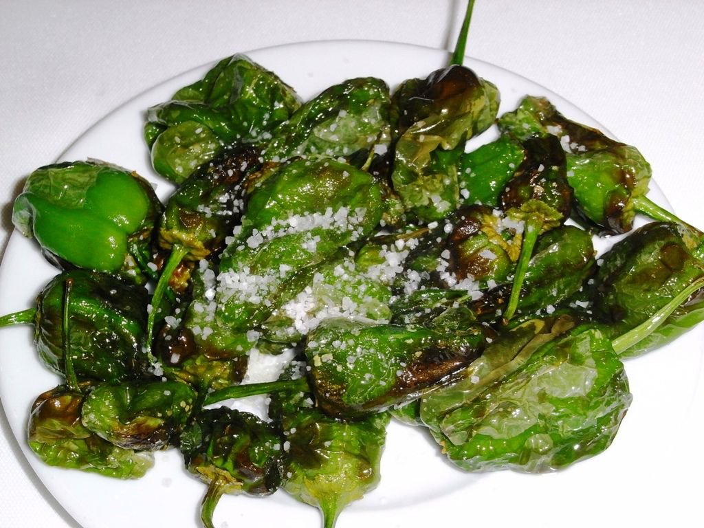ガリシア州パドロン産の小さな青唐辛子をオリーブオイルで素揚げし、岩塩をかけただけのシンプルなタパス。「10個に1個が辛い」というロシアンルーレット的な食体験で知られ、夏から秋が旬。バルの定番タパス。
