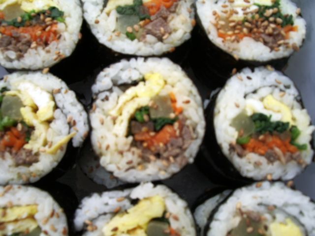 熟成キムチを細かく刻んで豚肉と炒める。チーズ・たくあんと共にごま油を塗った酢飯に並べ海苔で巻く。