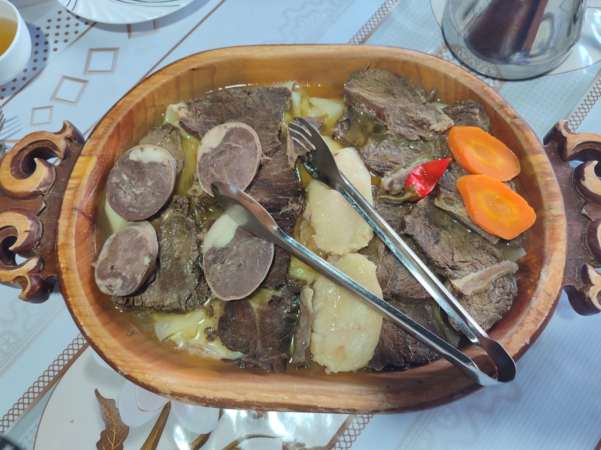1. 馬肉または羊肉(骨付き)を大鍋で2〜3時間茹でる。アクを丁寧に取り除く。2. 小麦粉、卵、水、塩で生地を作り、薄く延ばして菱形に切り、肉の茹で汁で茹でる。3. 玉ねぎを輪切りにし、肉の茹で汁と塩・黒胡椒で煮てソース(チュク)を作る。4. 大皿(アスタバク)に麺を敷き、その上に切り分けた肉を盛り、チュクをかける。5. 別椀でソルパ(肉の出汁)を添えて提供する。