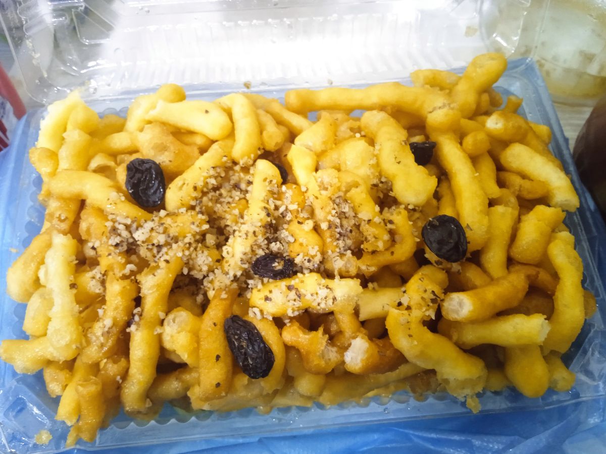 1. 小麦粉、卵、塩、少量の砂糖で無発酵の生地を作る。2. 生地を薄く延ばし、細い棒状(5mm×3cm程度)に切る。3. 油を170度に熱し、生地を黄金色になるまで揚げる。4. ハチミツと砂糖を鍋で加熱してシロップを作る。5. 揚げた生地をシロップに絡め、手早く混ぜる。6. 山型に積み上げて形を整える。7. 冷めて固まったら切り分けて提供する。