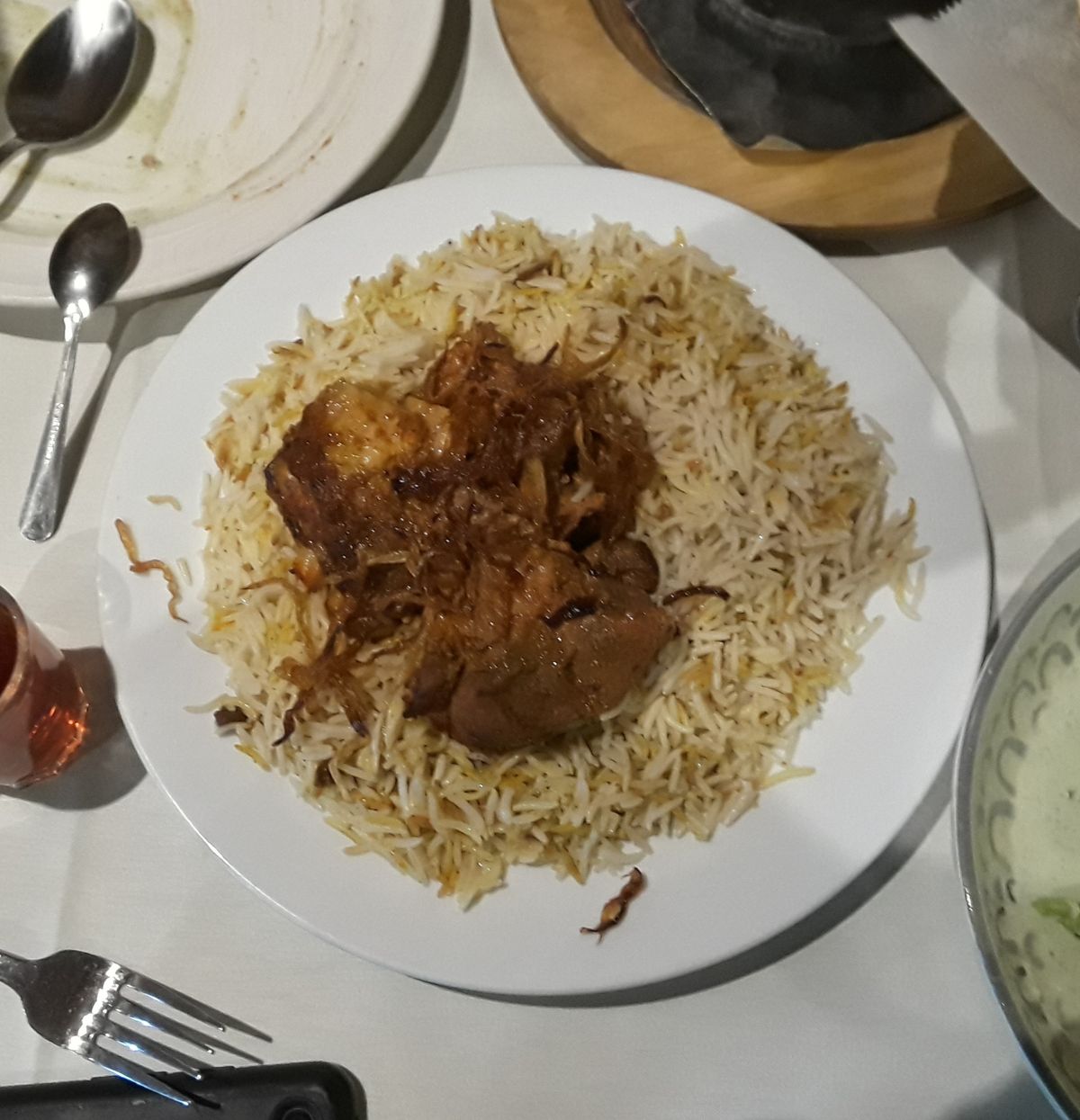 1. ラム肉(脚または肩)にクミン、カルダモン、ターメリック、にんにくペースト、月桂樹の葉、塩、黒胡椒を擦り込み、よく揉んで一晩マリネする。2. 蜂蜜を薄く塗り、タンヌール窯(または家庭ではオーブン130℃)で6時間かけて低温ロースト。途中で肉汁を回しかける。3. バスマティライスを別途スパイス入りブロスで炊く。4. 大皿の中央にライスを盛り、ラム肉を載せる。5. キャラメリゼしたオニオンと蜂蜜を少量かけ、芳香ハーブを添えて提供。