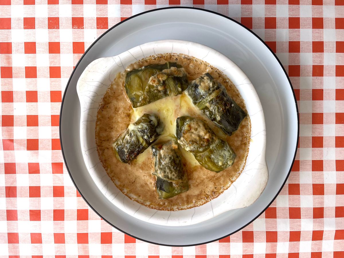 小麦粉200g、卵2個、牛乳100ml、塩少々でシュペッツレ生地を作る。ビュンドナーフライシュ50gを細かく刻み、パセリとチャイブのみじん切りを生地に混ぜる。フダンソウの葉を広げ、大さじ1の生地をのせて包む。バターを塗った耐熱皿に並べ、ビーフブイヨン200mlと生クリーム200mlを注ぐ。180℃のオーブンで30分焼き、グリュイエールチーズをすりおろして仕上げる。