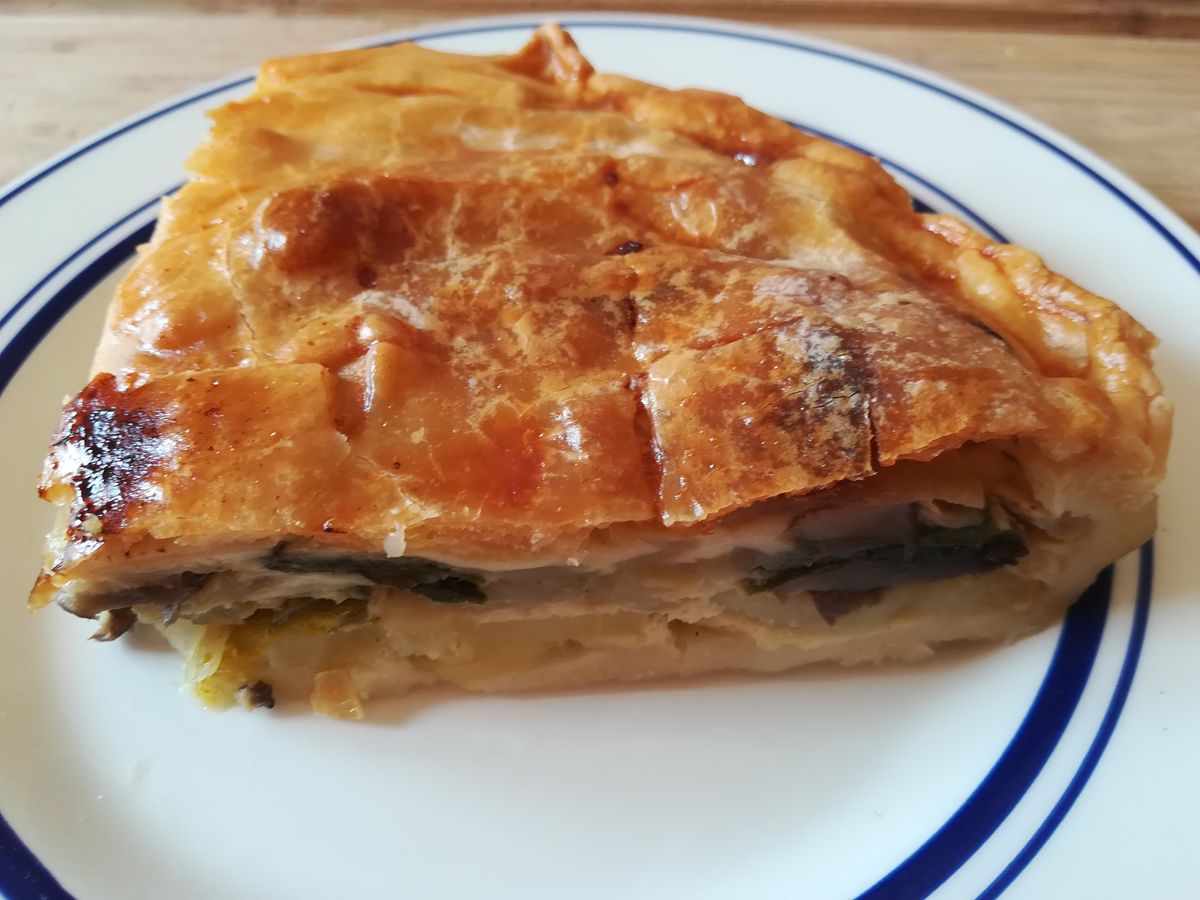 パイ生地500gを作り、半分を型に敷く。じゃがいも250gを薄切りにし、りんご250gは皮をむいて細切り、玉ねぎ250gはスライスする。リーキ1本を刻む。バターで玉ねぎとリーキを炒め、りんごを加えて混ぜる。型にじゃがいも、玉ねぎ・りんごの混合物の順に層にし、ラクレットチーズ250gをすりおろしてのせる。塩胡椒で調味し、残りのパイ生地で蓋をする。180℃で約50分、きつね色になるまで焼く。