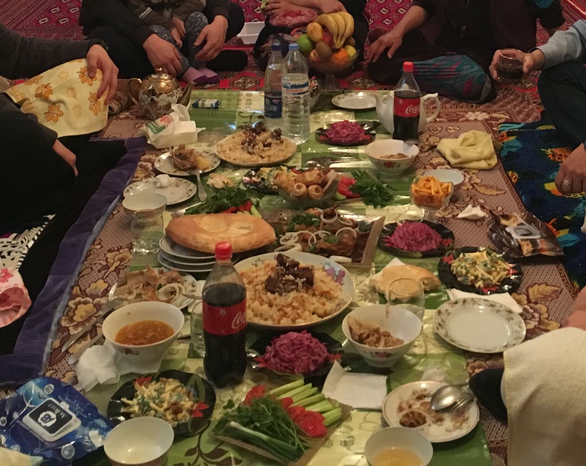 1. 羊肉を大鍋で塩とトマトを加えて骨から外れるまで柔らかく茹でる 2. タムディル窯でチョレク(平パン)を数枚焼く 3. チョレクを小さくちぎる(家族全員で行う伝統) 4. 玉ねぎを薄切りにし、ちぎったパンと混ぜる 5. 茹で上がった肉を手でほぐし、パンと玉ねぎに加える 6. 黒胡椒を振り、布に包んで20-30分なじませる 7. 器に盛り、熱い茹で汁をかけて提供する