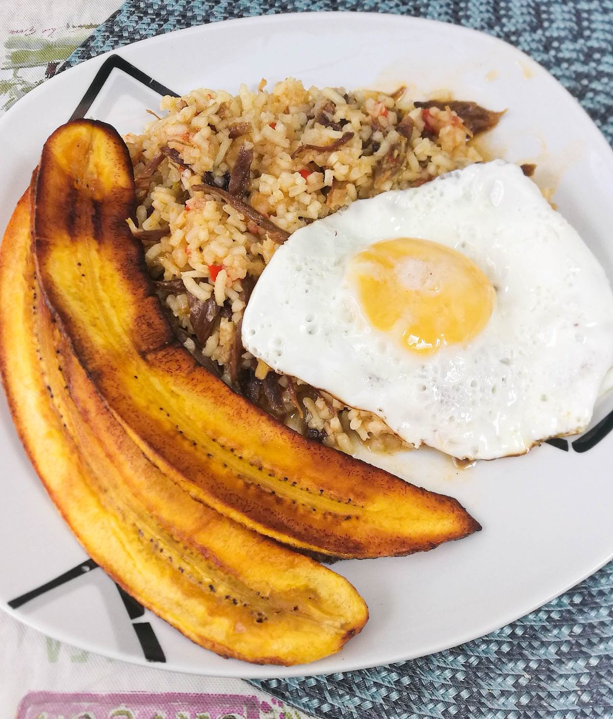 1. 干し肉を水に戻し、茹でてほぐす 2. 玉ねぎ、トマト、ピーマンをみじん切りにして炒める 3. アチョーテ(ウルクー)で油に色をつける 4. 米を加えて炒め、肉の茹で汁で炊く 5. 干し肉を混ぜ込み、蓋をして炊き上げる 6. 目玉焼きとプランテンフライを添える