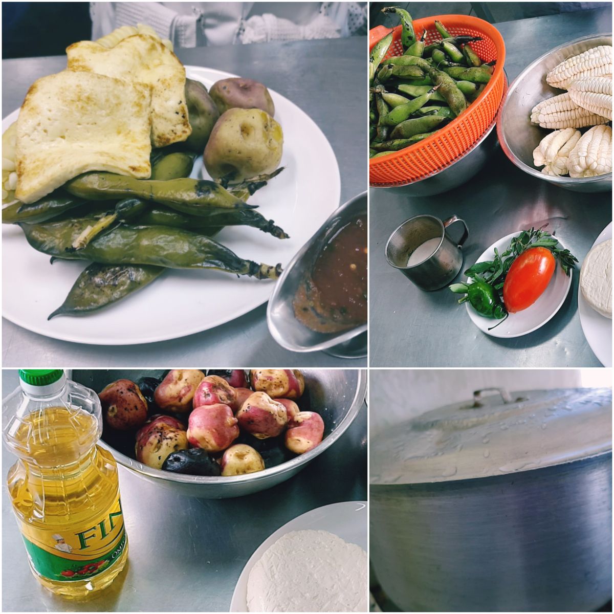 1. トウモロコシを皮付きのまま茹でる 2. ソラ豆を別の鍋で茹でる 3. ジャガイモを皮付きのまま茹でる 4. チーズをスライスして油で揚げる 5. 全ての具材を一皿に盛り付ける 6. リャフアを添える