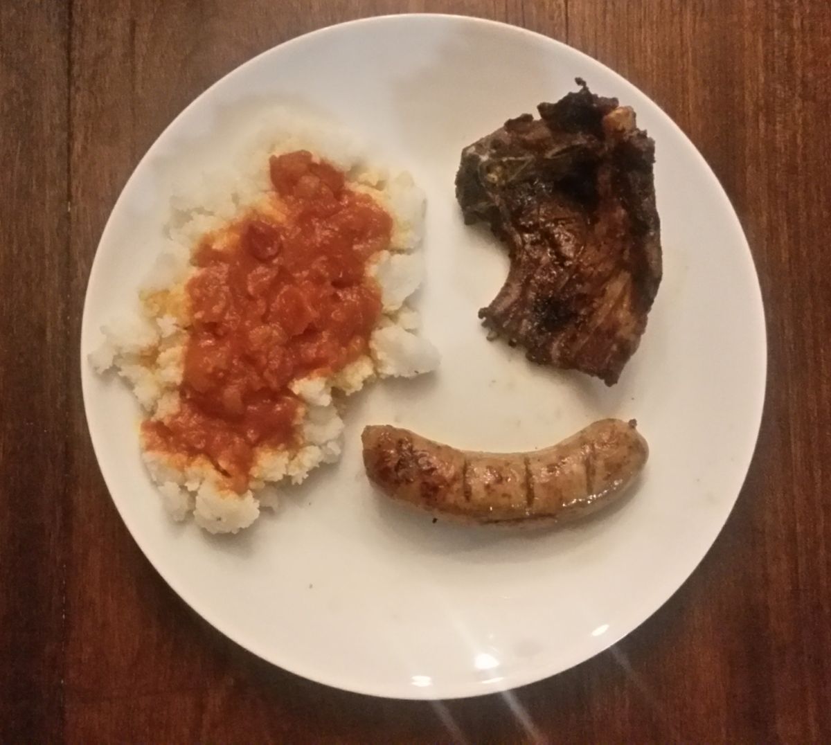 南アフリカの主食「パプ」(メイリーミール/白トウモロコシの粥)にトマトと玉ねぎのグレイビーソースを添えた料理。パプはアフリカーンス語で「粥」の意味で、固さにより3種類ある:スラップパプ(柔らかい)、プトゥパプ(中間)、スティウェパプ(固い)。ブライの付け合わせとしても欠かせない存在。